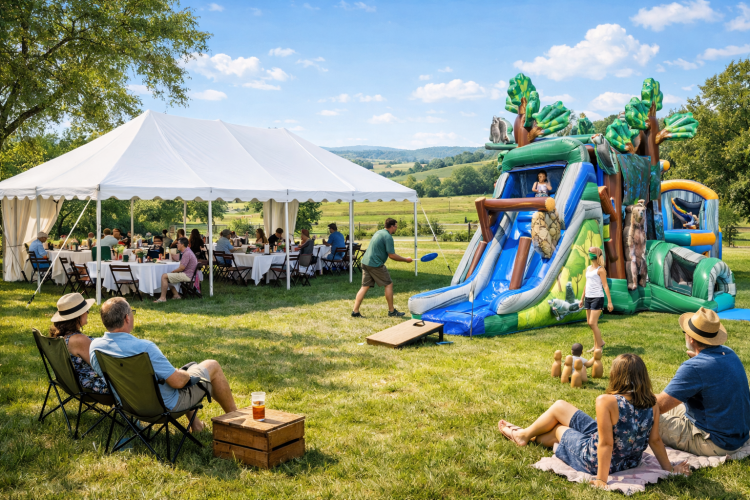 This rental pairs a roomy 20x20 canopy tent with an all-in-one combo unit, giving you both comfortable covered space and fun activity in one package. The tent provides about 400 square feet of sheltered area—enough for tables and chairs for a meal, a gift or sign-in area, or a shaded lounge for guests—protecting people and items from sun, light rain, or falling debris. Sturdy frame and secure tie-down points keep it stable on lawn or pavement, and its open sides make it easy to move people and supplies in and out. The combo unit is a multi-feature inflatable that typically blends a bounce area with additional attractions such as a slide and an obstacle section, so kids get the free-roam bouncing they love plus extra climbing and sliding play for added excitement. Together they make a versatile setup for backyard parties, school events, company picnics, or community gatherings: the tent offers a practical hub for food, seating, and shelter, while the combo entertains children safely nearby under adult supervision. Easy to set up and pack down by the rental team, this combination keeps activity organized, visible, and comfortable for hours of reliable fun.